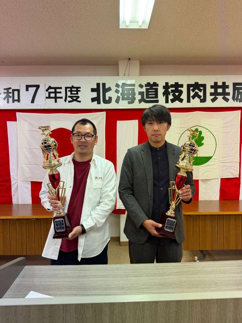 全道各地から集まった高品質な枝肉の中、交雑牛の部で㈲緑陽肉用牛牧場(奥秋和博氏)、乳用雄肥育牛の部で市田卓志氏が最優秀賞の栄誉に輝きました。