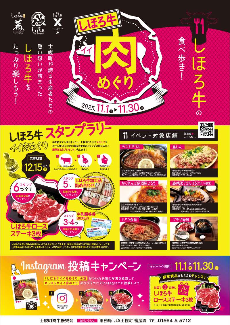 飲食店を巡り、『しほろ牛』の食べ歩きをしてスタンプを集めて応募すると全店舗制覇で応募者全員、その他は抽選で豪華賞品をプレゼント!!